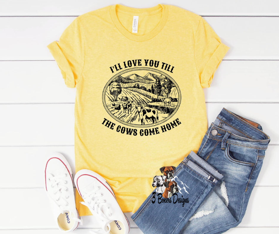 "Show your love with this fun and quirky shirt that will keep you smiling until the cows literally come home. Made with high-quality materials, this shirt is perfect for everyday wear or as a unique gift for your loved one. Because who doesn't want to be reminded of your love until the cows come home?!"